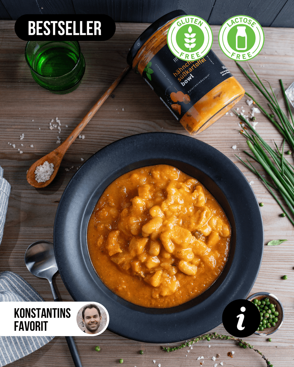 Die Gerichte verwenden wir nur gute Zutaten. Wir verzichten auf Zusatzstoffe und Einfachzucker. Alle Gerichte haben einen hohen Proteingehalt, gesunde Fetten und komplexe Kohlenhydrate.